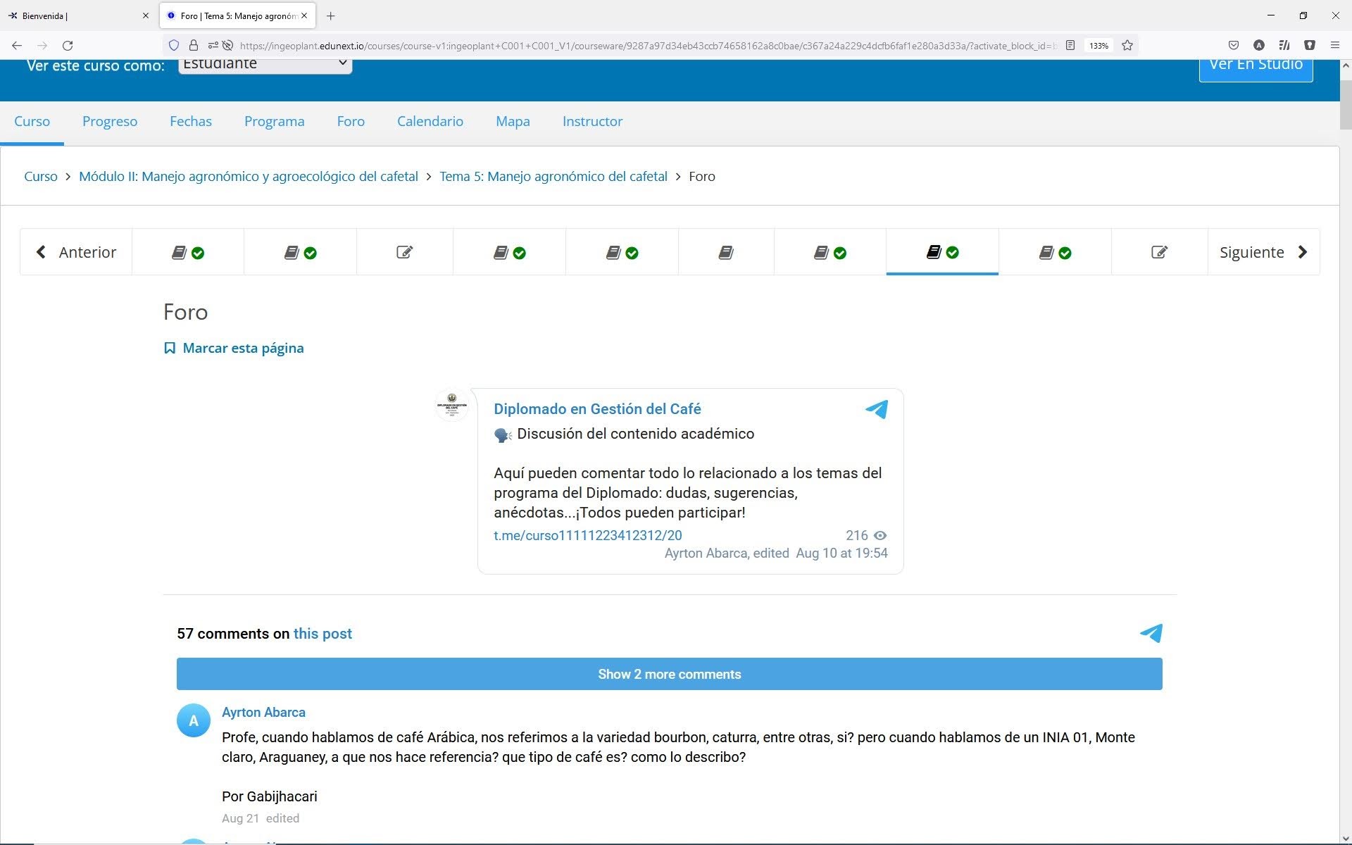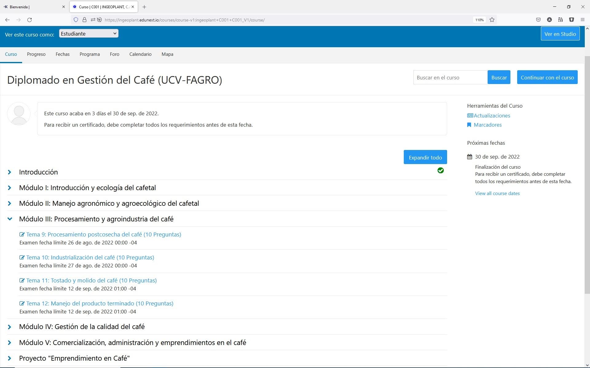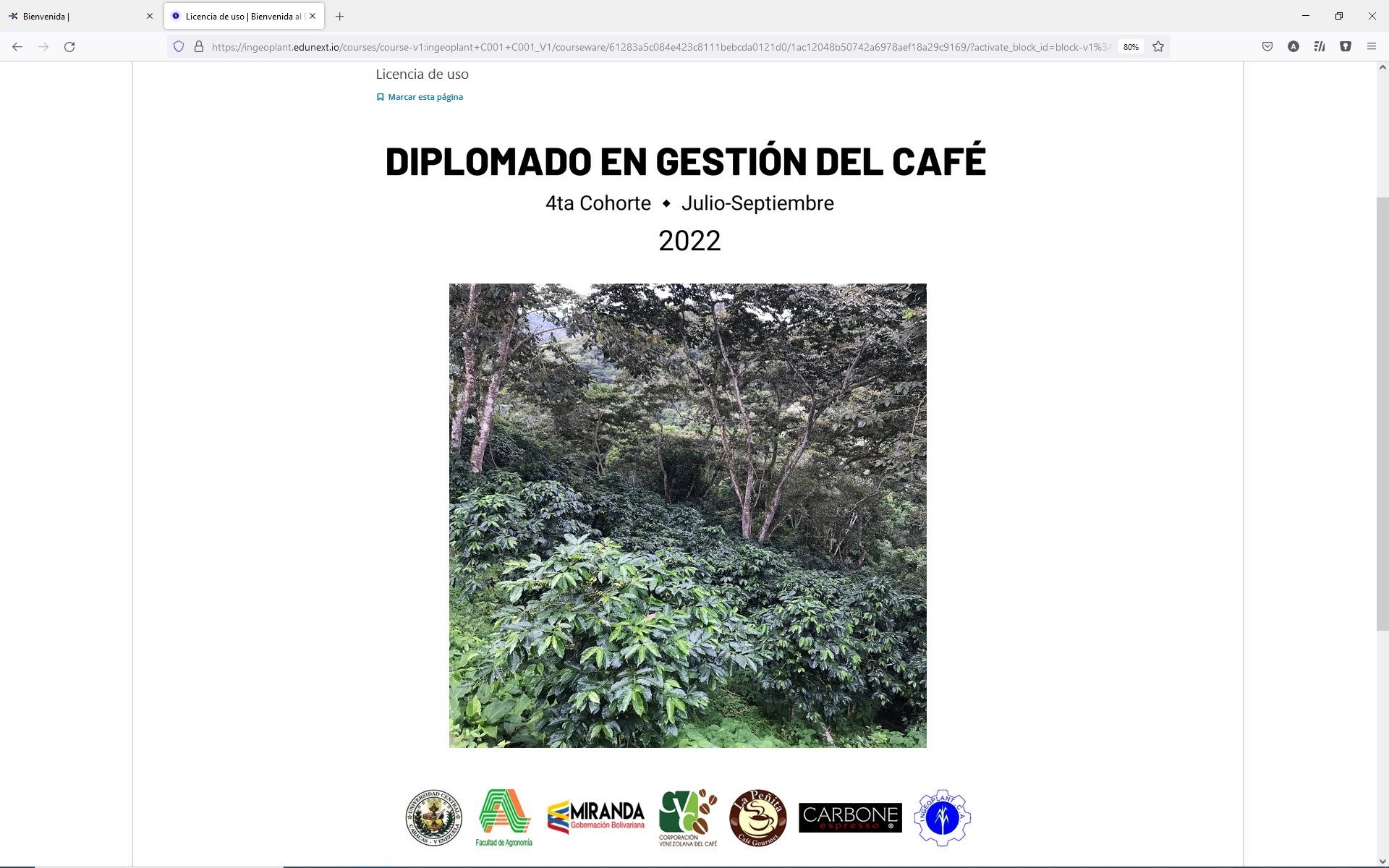 Entre el 11 de Julio y el 18 de septiembre, se impartieron los módulos teóricos del Diplomado en Gestión del Café, en su 4ta Cohorte, organizado por nuestra empresa, bajo la supervisión académica y certificación de la Facultad de Agronomía de la Universidad Central de Venezuela. Para ello, se utilizó la plataforma de enseñanza online eduNEXT.