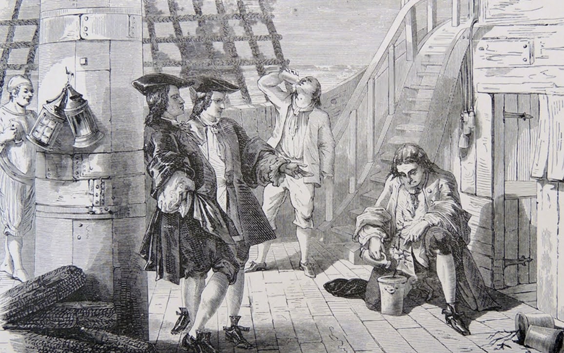 Ilustración del alférez de Clieux regando el cafeto en su travesía a Martinica.